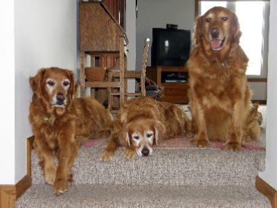 2003: Scarlet has been with us since Saturday. She is between 3 and 4 years old and spayed. Her coat is a medium red and pretty thick right now as she spent a lot of time outside during the winter. Scarlet is a littermate to Jake and the owner wanted to keep them together if possible. Scarlet loves attention. She will let you pet her forever if you have the time. We took her for a short walk on Saturday and she wasn't liking the Gentle Leader at first . However, she did really well for being in a strange place. She has had a small amount of obedience training and she listens well. Scarlet is used to cats, but I haven't let her loose around our two cats yet. She is good with children and has been around a 2 year old. If she thinks she is going for a ride in a car she gets all excited to go. Scarlet has a stocky body type, but does need to lose some weight. She is used to being fed with her brother, Jake, and I am not sure if she got more food than she needed or what. Scarlet is more of the follower with Jake being the leader. She does get worried if Jake is taken out of her sight. She has a typical Golden personality - extremely friendly and loving.