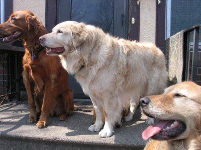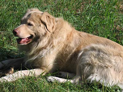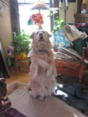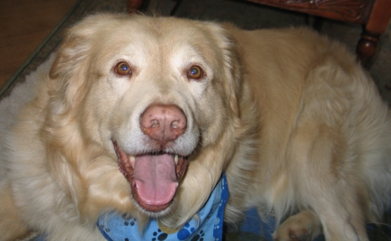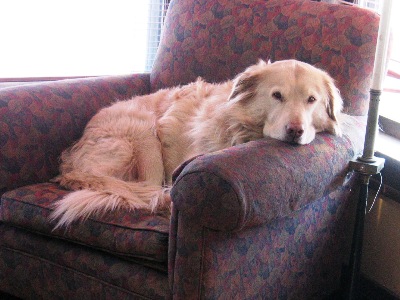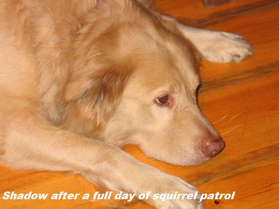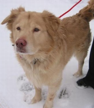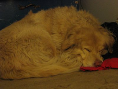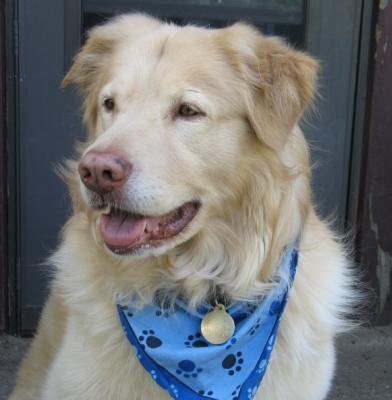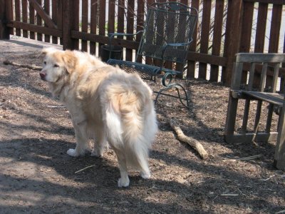 Shadow was SPRUNG from the kennel earlier this week after two months of concrete floors, which can't have helped his hips. He is just as he has been described below, a big bold cream puff of a guy. He's a really happy boy, LOVES to ride in the car and go for walks, and is really a good dog. He has gotten along well with my two Goldens. He does want to chase the cat, but the cat is very dog savvy, so we are working together (the cat and I) to teach him that game is not such a good one. Shadow spent the first night in the crate and did just fine. The next couple of nights, he slept upstairs with the rest of us (although I gated the stairs so he couldn't come down for a midnight cat treat), but last night, I skipped the gate and he slept by the side of the bed all night. He's had free roam of the house with my other guys and there has been no problem. (He does like the couch, but that's sort of the status quo here.)