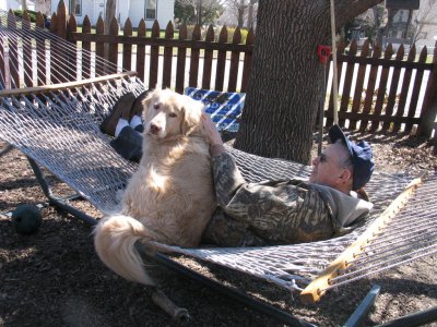 With all the nice weather the last few days, it was time to get the hammock out of storage. Once it was set up, seemed to remember it from last summer. When my neighbor (Shadow's godfather who has taken such good care of him when I have long days) flopped down in the hammock for a trial run,