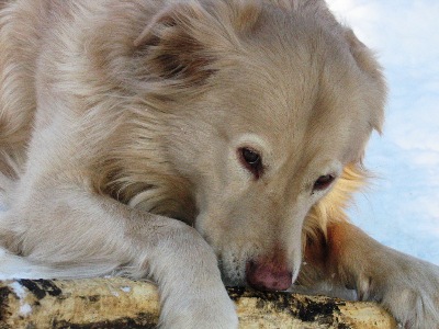 Shadow, contemplating that the grass really is greener if you have a bone to chew onOn the porch, listening to wolves.