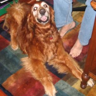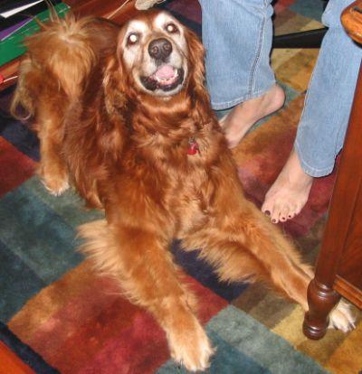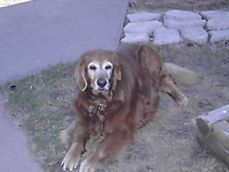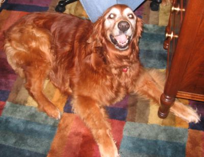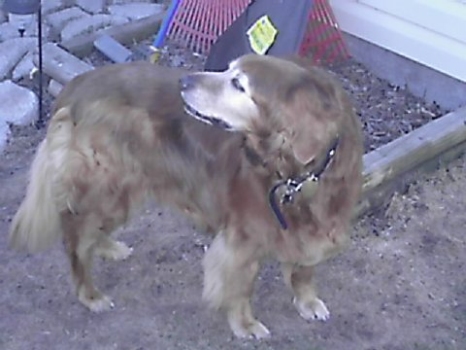 3/18/06: Steamboat has settled in nicely. After coming into the craziness of our household with our boys so excited and another Golden waiting to be transferred, Steamboat has done well. She still hasn't eaten, doesn't like dog treats but she has drank alot of water. She isn't a real fan of cats. When they walk by her, she will only sniff. When they jump up on the bed and she is laying there she will go after them and let them know that they are not "allowed" there! She gets along fine with the other dogs and really enjoys my adult children. She loves to go walking. We take her for a couple of blocks at a time, then come back. Her fur is so very silky soft, and her personality is so sweet and kind. For 11 years old she has alot of life and love to give a special family.