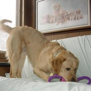 Sunny is a handsome and intelligent Golden Retriever/Yellow Lab, neutered and up to date on vaccinations. His coat has thick waves, and he has feathers on his haunches and tail (he has a wonderful head confirmation!).