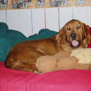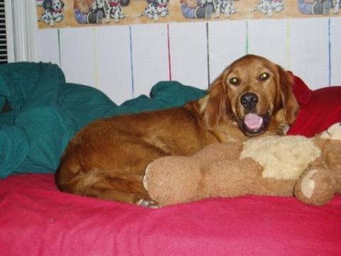 11/3/05: Sunny arrived safely Saturday and came into a house for the first time in her young life. Needless to say, she loves life in the house where she can snuggle up to people and jump in a bed to cuddle with a child. Even though she had never been in a house before, she knows to go to the bathroom outside and has not had an accident. She had been an outside dog who has not had much socialization with people; therefore she is somewhat submissive and timid. This has been improving since she arrived. She is very sweet and prefers the company of the family than even to play with the resident Golden. She has rapidly become attached to members of the family, will look for them in parts of the house and will even whimper until she finds them. She had to learn to go up stairs. It took many treats to get her to go up. She now sprints up and down as if it is a new trick. She gets along with everyone in the family, both kids and adults.