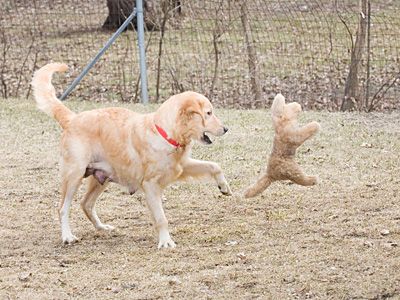 Our little blonde girl is experiencing her second childhood, or should I say the childhood she never had. She plays with stuffed toys, digs holes, and tries to grab things from the table. Once I found a t-shirt and socks in her crate! She also beheaded a toy moose and hid it inside the cushions of the couch! Suzie is not ready for free roam of the house because she is still too inquisitive for her own good!
