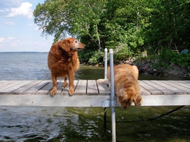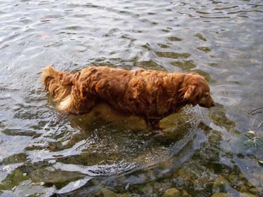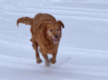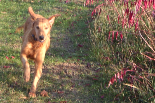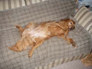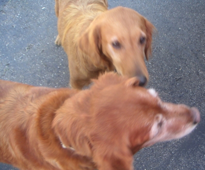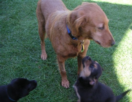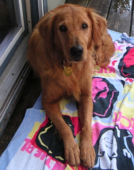 As you can also see from the pictures, her fur is continuing to grow out. She has long curls on her rump, feathers on her legs and her coat is also getting long on her underside and pretty curly everywhere. I must admit that I have now learned however, that Goldens DO SHED. She fits in with the other two furbutts around here on that issue as well.