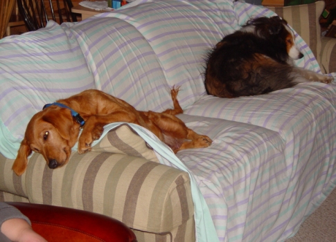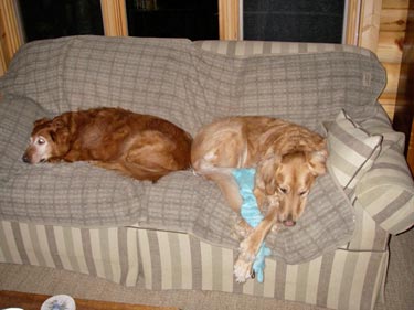 Cody is getting used to the idea that Terah is here for the duration. Both ends of the couch used to be his, but each pup has now claimed an end. When she's in the cabin, that's usually where she can be found. No room for Dave!!!