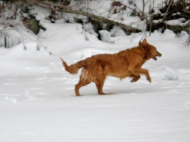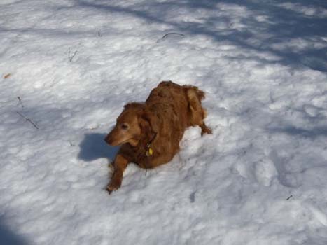 She had the sweetest personality and an absolutely gentle demeanor that everyone fell in love with. She became a mama's girl and was always happiest when she could be close to me. She followed my every move and could always be found somewhere nearby me. She never did learn how to play with toys or with other dogs but she did get great pleasure out of romps outside in the snow and grass, taking a wade in the lake and exploring the woods. While she didn't understand the concept of play she always looked to her two fur brothers for guidance, security and support. She didn't even bark for the first year we had her, but once she learned she wouldn't get into trouble she did her best to join her brothers and sound the alarm when anyone came to the house. It was wonderful to see her evolve from a timid, anxious, nervous girl into a pup that realized it was O.K. to be a dog and to engage in doggie activities without fear of punishment.