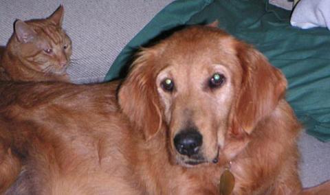The storm doesn't seem to really bother her, but she didn't care for the rope attached to her and would pick it up in her mouth. But when called to come in the house she is right there. We are about to try feeding time. Will let you know how it goes and how she does tonight. Can I get 3 Goldens and 2 cats on a bed? Oh yes, she met Sam, Mr. Friendly Cat, and just ignored him. Not sure if she ever saw a cat before, but guess she must think he's ok if the other dogs do. I think it will be great for her to be around other furbutts. Her coat is very dry and has no soft under-coat and so we'll see what we can do with that. Tomorrow we'll do the bathing and ear cleaning after a good night's sleep, hopefully for all of us.