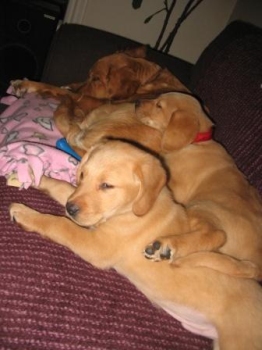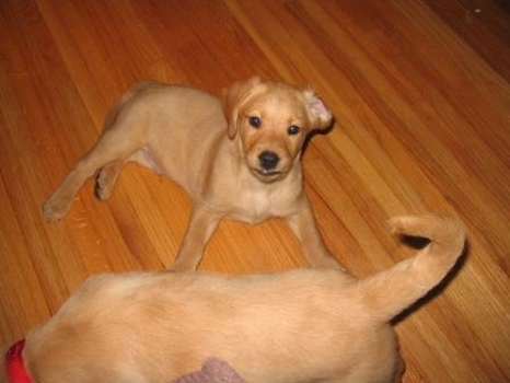 Murray is more independent than Teddy. He doesn't like being alone for very long either, but can tolerate a little quiet time on his own every once in awhile. Though I suspect he just needs a break from Teddy sometimes. There's another picture below of Murray taking a quick break from playing with Ted. Murray is quite a bit smaller than Teddy, has a smaller appetite, and is more calm. He just seems to be more thoughtful. I think he's going to be a very smart dog! Though probably on the small side for a Golden.