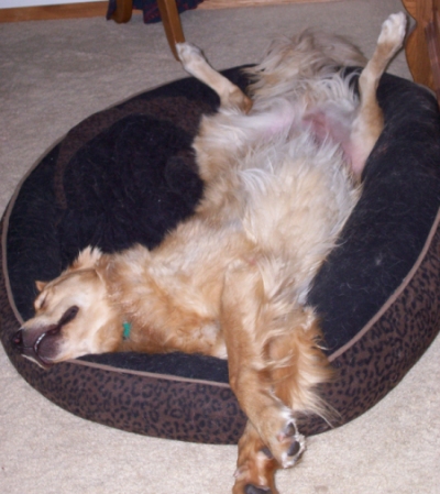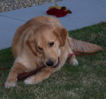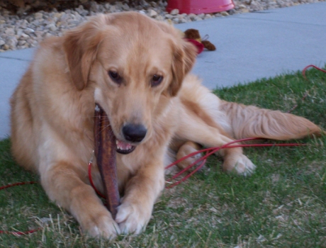The greatest part is that Mom went to the pet store and got these things called Bully Sticks. I've sent you a couple new photos where I'm chewing on these Bully Sticks; they're the BEST! She told the store clerk that I'm going to be having this TPLO surgery thing, and that the only thing I'd be able to do is chew on stuff, and they recommended - BINGO, the Bully Sticks. Mom is really starting to catch on to what I want. I think I'm a really good teacher. I gnawed one down to half it's size tonight; I was busy for about four hours doing that, and I think Mom missed me because I'm usually right there, helping her do everything.
