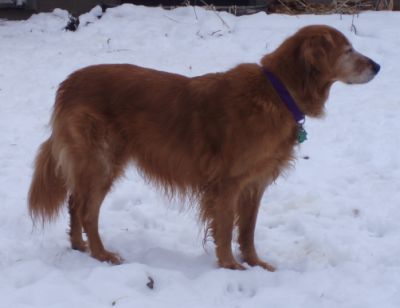 Tillie is a sweet natured senior who will be turning 11 on 12/30/07. This beautiful girl was turned over to RAGOM due to a change in her family's circumstances. Imagine raising a dog from a puppy only to find yourself having to make a tough decision. You see, Tillie’s owners where transferred to another country and if they took Tillie with them she would have gone through several months of quarantine. They were very concerned that this would be very difficult for Tillie. Tillie is a bit confused by finding herself in a new home, but she is very loving to all she meets, gets along well with other dogs, and pretty much ignores the cats. When Tillie first came to my house a week ago she was very active and looked to be in great shape for a senior. Last night her back legs gave out on her and she had difficulty getting traction on my hardwood floors. After a quiet night of rest we made an early morning visit to the vet. Tillie was quite a trooper, letting the vet check her over without a fuss. She seemed to understand we were trying to help her. Her initial check up of eyes, reflexes, back bone, etc. was good. Blood samples were taken and I won’t get the results until Monday at the earliest. I will post as soon as I find out. Fortunately she is doing much better on her feet today, and I am letting her take it easy.