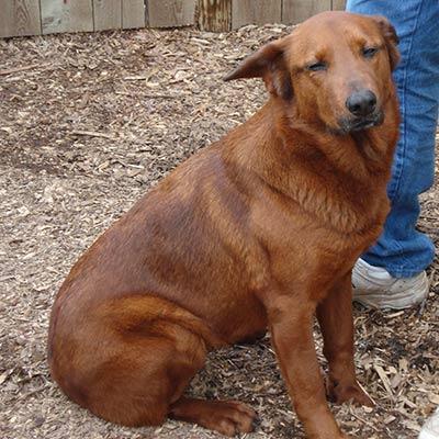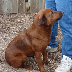 4/7/07: Meet Trisha! Trisha came to us from a shelter in Missouri and is very well kept. She is in very good health and is vaccinated. Trisha will soon be spayed.Trisha is definitely kennel broken and appears to be housebroken. She is very friendly and affectionate. She has experienced some type of abuse concerning her collar. She didn't want me to put one on her when I first got her home and she hasn't liked being "grabbed" by the collar to leash her up. She is definitely getting better now that she trusts me. She had a bath day one and wasn't real excited about that, but tolerated it.I think Trisha would be best placed in a home with older kids. I have a 6 year old and 9 year old. She is always happy to see them. She is also the dominate female in our house and tends to guard food.Trisha is absolutely the most unusually colored dog I've ever seen. She is copper red, with black tips on her coat. Definitely some Shepherd in there. About 45#, I'd call her medium sized, smaller than most Goldens. She is very pretty. She does not jump on me or the kids and I love that! She is very well-behaved and quiet. We haven't tested her on cats, but will soon.