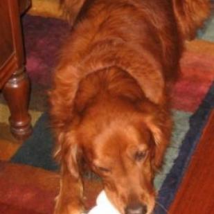 In case you are not familiar with me, I?ll give you my story. I am 6 years old and have lived with a family with three children. I am a pretty red and only weigh 68 pounds. I lived with my first family for my whole life until my love of chasing rodents got me in trouble. At my new foster home I have been told there are many deer, but I don?t think I will be chasing them even though I can see them out the windows. I didn?t make any noise even when I met Seka & Hobo initially.
