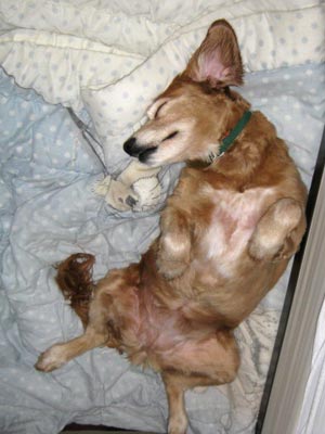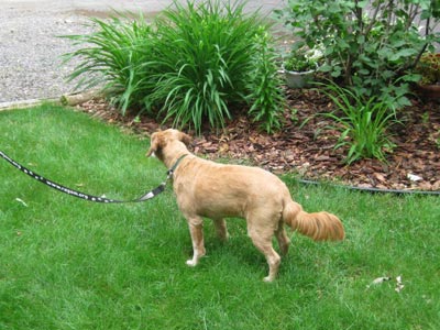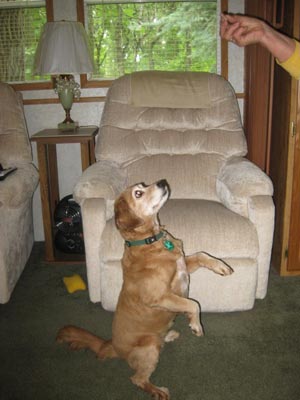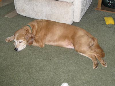 Meet Miss Trixie 11-205. She is what could be properly described as a small (toy) Retriever. She was found as a stray having to fend for herself during the flooding in Sioux City, IA. She was given the birth date of June 13, 2004 because she was estimated by a RAGOM Vet and staff to be 7 years old. She is a Golden Retriever/Cocker mix who is 26.5 lbs. and very petite. She measures from her head to the floor, 20”, from her back to the floor, 17”, and is 24” from her nose to her butt. She has the ears, legs, feet and tail of a Golden Retriever and a Cocker face and eyes. She is a medium golden color with a beige/white face and a beige/white freckled underside like the colors of a party Cocker.