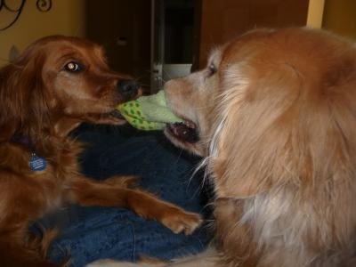 - He would do best in a home where he is an only dog. He gets along well with my dogs as long as he does not have a toy; if he is playing with a toy and they walk by, he gets pretty snarky. TRUMAN ONLY EXHIBITS THIS BEHAVIOR TOWARDS OTHER DOGS! Humans, including small children can take ANYTHING away from him, he just doesn't like it when other dogs are near him when he has toys. He will NOT try to take toys from other dogs and he does not resource guard food, only toys. I think the right owner could train him to share. On the good side, this IS his only bad trait. I've attached a photo where oddly enough, he is playing a friendly game of tug with resident dog, Sophie (this is why I think he could be trained).