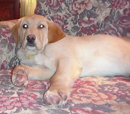 Being a puppy, Alex is not housebroken. We're working on it and honestly we have not had an accident in the house when he is out with us. We keep him in a small bathroom at night and while we're at work, and he goes on the papers. Amazingly, he does not bite or nip or anything along that line, it truly is amazing. He's very gentle, understands no, and comes when he's called. He loves people and dogs and will always be in the same room with someone (human or dog). He has learned to play with lots of toys and retrieves balls already. We have gone for a walk every day and he loves walks. He really likes to hang out with the big dogs and keeps up very well. We're working on that pesky leash!!