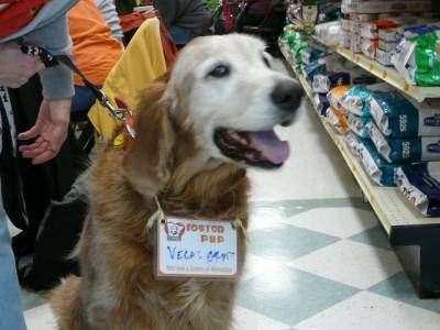 Last night Vegas went to a RAGOM presentation to the pre-vet club at the U of MN. As you can see from the pictures, he and Murphy were not very interested in the lecture, but when it got to the “Hands on” part of the program, Vegas was very happy. He got lots of petting and felt it was worth waiting through the talking part.