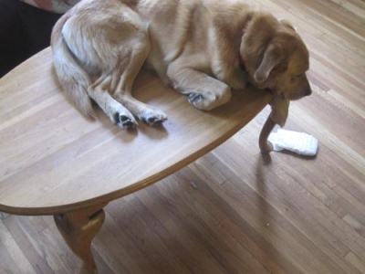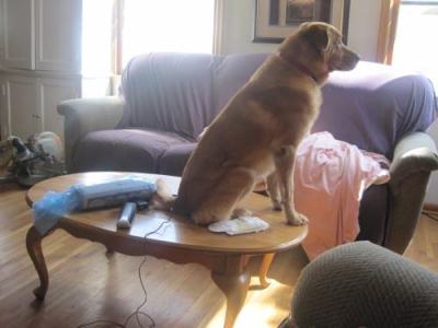 One thing that is very odd about this gentle soul is that he thinks that he can sleep, sit and stand whenever he pleases on my coffee table. Yep remember that question in your home visit? What would you do if you came home and found your dog on the table? Well Vince is showing me that there is a good reason for that question. I came home from work the other day, fell asleep on the couch and woke up to Vince sleeping next to me on the coffee table. Came out of the bathroom after taking a bath and there he was sleeping on my coffee table. When he gets really excited he jumps right on up to his favorite piece of furniture and prances around...on the coffee table. No matter how many times I tell him to get down, he gets right back up there again. And yes I have pics to prove it :0).
