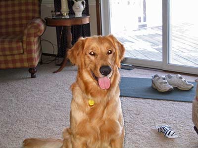 1/17/06: Zeus has finally settled into our household. What a great dog! He is full of sunshine and happiness everyday. Zeus is an active playful 3 year old that loves tennis balls and anything that squeaks. He is a retriever as well. He will bring his balls to you (sometimes 3 or 4 in his mouth at once) and drop them at your feet to throw. He immediately zooms off after it and returns it to you. Will wonders never cease. He lives to have you throw his toys. If you are busy and he can't convince you to throw it he will do it himself. He picks up his stuffed animals and tosses them into the air, lays on his back and chews them and begs for anyone to play tug-o-war with him. He is very playful with our older dog and sometimes can convince her to roll and tumble around the house. He is a speedy guy who burrows through the snow and rolls around in it for the sheer joy of the feeling. He's a hard guy to watch and not start grinning at the fun he is having.