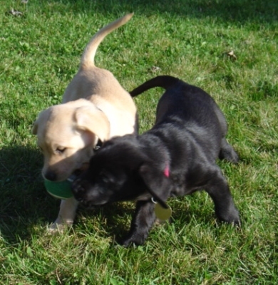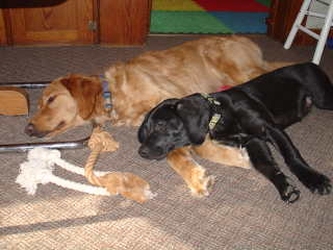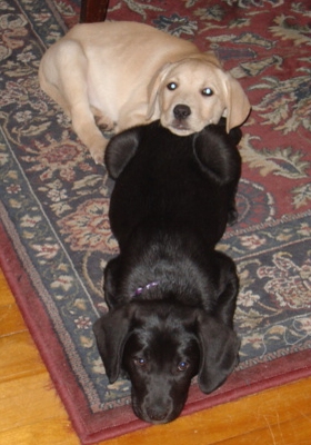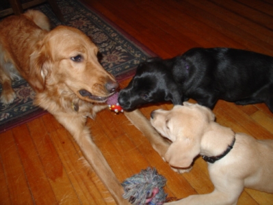 Now, on to the good stuff. Potty training is progressing nicely. Zoe still does not have any set signal, but is catching on to the right location to do her thing, and a treat now and then doesn't hurt :) She is sleeping through the night in her kennel, 8 hours, which is wonderful....and has no accidents in the kennel when she is left for a couple hours here and there. She has a very sweet and calm personality. She is not a typical active all the time puppy, some of which may be her heart condition, but she is very easy to live with. She absolutely loves our 1 year old Golden, and wants to be with him at all times. I think it would be nice for Zoe to go to a home with another dog, just not one that would play non-stop. She has not yet been without a dog companion, so really not sure how she would do. She is still curious about the cats, tries to get them to play every once in awhile with a pounce towards them or a bow and a bark, but to no avail. She is wonderful with kids (even our 2 year old), and really is great with people of any age. Everyone that meets her says that any family would be so lucky to get a dog like her, laid back, smart, affectionate. She is a real sweetheart.