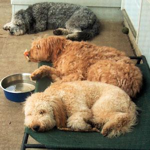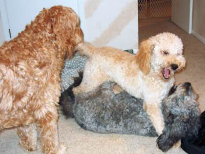 Let me tell you a little about myself. I am 9 1/2 month old female and was born on May 29, 2010. I am 32 pounds and 21 inches tall at my shoulders. FM thinks I am really a mini-doodle as I am quite a bit smaller than the other doodles here, but hey, that makes me really portable and easier to control. I am VERY outgoing, confident and love new places and adventures. I have been to Chuck & Don's and even helped behind the counter (Hmm, a proper application of counter surfing...). If I could learn to run a cash register, I bet they'd give me a job! I've been to a number of other houses to meet more dogs and even a cat. At one house, I did get into a little tangle with my new friend Maggie, but we got over it quickly. I think with the five of us dogs all excited, we both over reacted a bit. After that, we were all cool and no hard feelings. I kinda did that to my new foster sisters when I first met them, but after 15 minutes, we were all chasing each other in the back yard. I also met Poco, the dog-savvy test cat. At first I wanted to lunge and play with him. Then I got to get up close and personal and I kissed him all over his face and was trying to get him to play. He wasn't up for that. As he ran away, I would have followed, but someone threw a soft toy past me so I went for that instead.