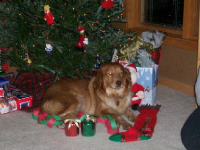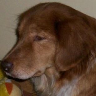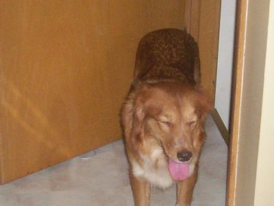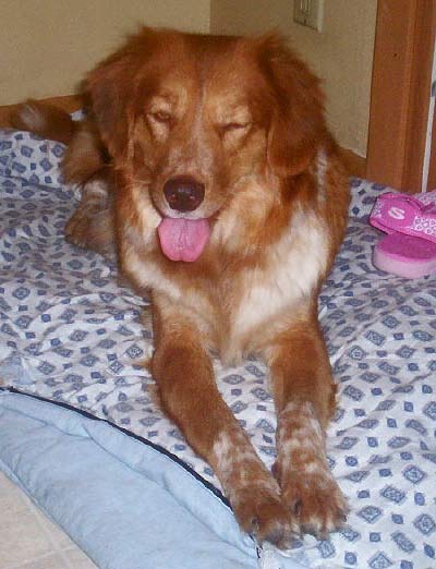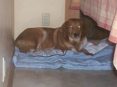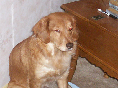 10/22/06: Zuchie has arrived in Marion, Iowa. This beautiful, petite Golden mix and 5 of her two-week-old babies have come to live with us. Zuchie is one of the Missouri dogs brought to RAGOM after being rescued from a farm with way too many dogs.